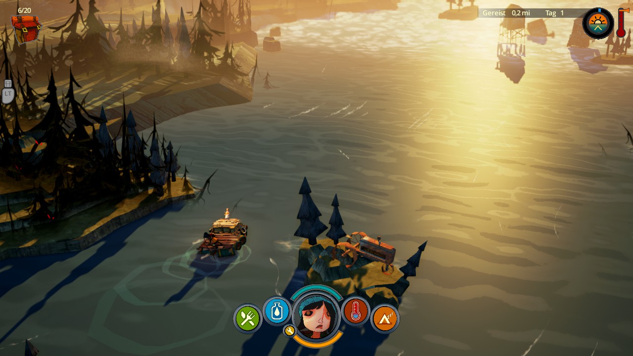 Now that your journey begins, you’re playing through a small tutorial that shows you the most important information needed to survive via signs that can be found across a camping ground. Those signs show you information regarding your inventory, crafting, stats, and dangers. After that, you’re pretty much left alone and although it’s the tutorial, you’re not safe yet since your stats diminish per second. Those stats include hunger, thirst, temperature, and fatigue. If any of them reach zero, Scout will die. To prevent that from happening you’ll have to collect materials in the starting area and the little islands that you encounter on your adventure. The game consists of two types of levels: The river and the islands. While you’re able to walk on the islands, search for loot and hunt for food, you’ll have to manoeuvre your raft across the river and head for different islands that contain different loot. This, however, is easier said than done since the currents are often so strong that there’s no returning after you’re going into one direction. Most often the game isn’t forgiving you for ignoring one island or choosing one over the other. You’re usually left with little to no time to think before your raft steers into one direction, so you have to make quick decisions: