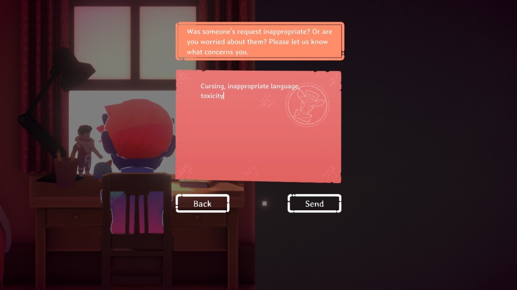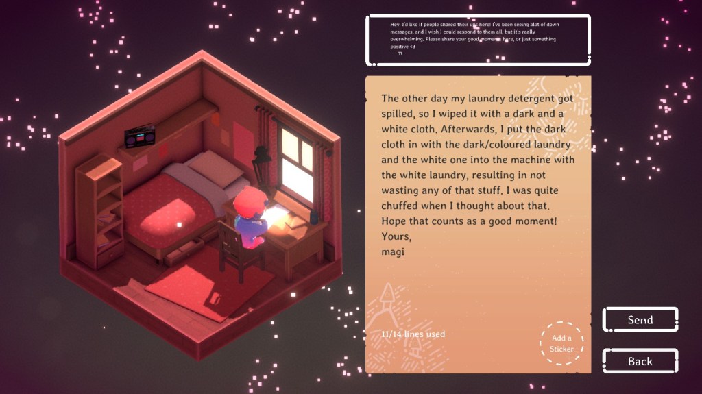 I already covered all the gameplay there is, to be honest. I feel like it’s more of a social experiment than an actual game. There’s not much to do apart from being nice to people who need some kindness. I’m sending virtual hugs here and there, talking about my experiences with similar situations and overall try to comfort people. I feel quite nice and I also received some heartwarming answers to my requests even though I didn’t even feel down at all.
