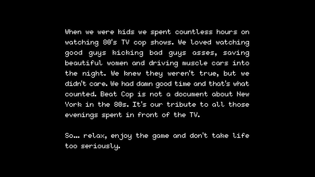 In today’s review, we’re taking a look at Beat Cop, a game in which we’re an ex-detective who is being framed for crimes he hasn’t committed. On his last case, he got into a Senator’s house, only to find a burglar of sorts who has already been taken care of and an empty safe. He’s accused of having stolen the diamonds that were in the aforementioned safe and hence gets demoted to a Beat Cop, having to patrol the streets – or rather one street – in Brooklyn, write up tickets, catch thiefs, and prove his innocence.
