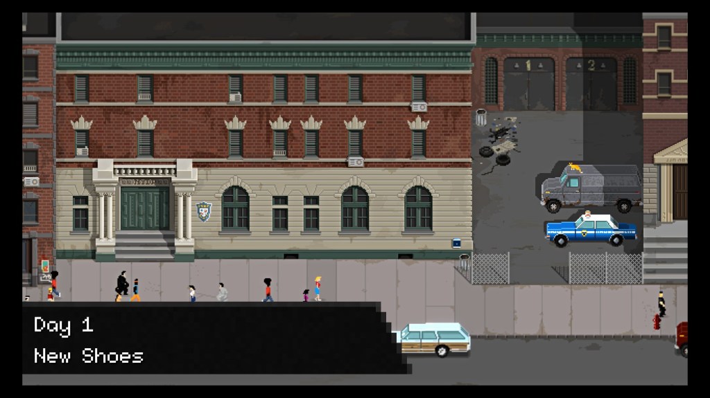 While the art-style is rather detailed for a pixel-art style, it’s not too special when compared to other games that came out in 2017, like Dead Cells. The music is great!… when you hear it. Usually, you’re left with the sounds you encounter in the street which is rather boring and doesn’t add much to the game. I found it quite disappointing. It’s got slice-of-life vibes here and there with the ordinary tasks of being a beat cop and with the lack of music, I guess, but I doubt that that’s intentional. Here and there you hear music when there’s a boombox nearby but the mixing feels kind of off as well, as it gets really loud when you’re right next to it but is already silent when you’re only a few steps away.