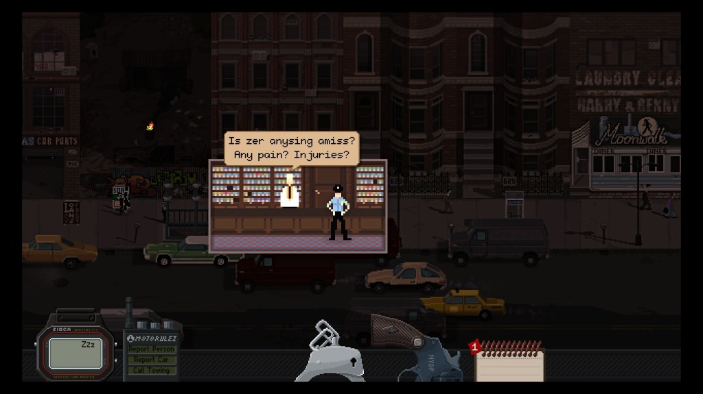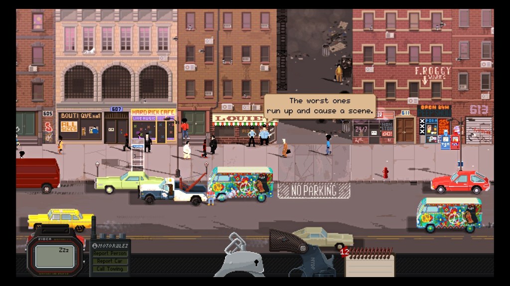 Your first steps revolve around writing up tickets. You check a car’s tires, lights and the parking-meter and then get it towed after leaving your ticket at the front window. You then patrol the street, talk to different people and shop owners and take care of their needs, while fulfilling your quota on certain tasks. The game’s played with your mouse only, resulting in a point-and-click-like feeling. The ticket-writing-process kind of reminded me of Papers Please, which I found rather nice. At first, this gameplay may seem rather boring, especially as you’re usually left with no music at all, but when you’re getting busy and you’re running out of time to fulfil your quota, shit goes down.