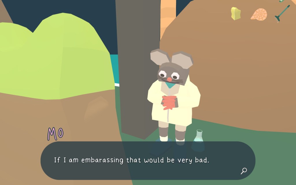 Once we arrive at the scene, we have the opportunity to question everyone on the island and search for clues as to why the ghost scientists are on the island, where the ghost might be and whether or not there’s an actual ghost at all. During our time on the island, we’re able to search for clues and find items that we can trade in with other people in order to receive other times that are needed to solve the case. At our search for clues, we are also able to take care of a sloth’s mental health, help out a worried rat, have an interesting chat with the suspicious lobster, Larry, and, in the end, have a nice dance-competition with everyone on the island.