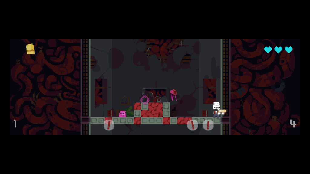 Frankrekkk did a great job to portray the inside of a whale. It’s very red and it almost feels as moist as I’d imagine a gut to be… The enemies also come in a bit of variety with new enemies for each area and new patterns for their movement. There are small jellyfish that chase you around in the first level alongside mushrooms that are shooting bullets at you and small whales eating away at the blocks that stand before you. Down below, in the next bigger area, you’ll find a lot of skeleton foes that move based on your movement while there’s tankier enemies further below that hit hard and are able to take more than just one or two hits.