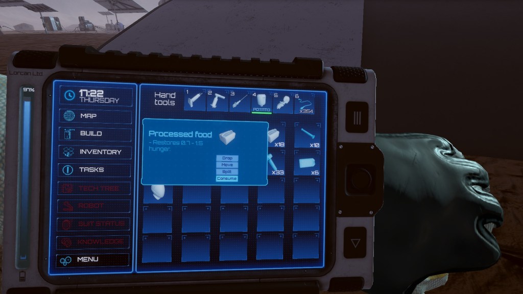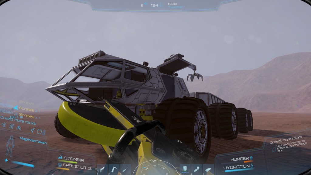 Buuuut… it’s super janky. I struggled for ten minutes to try and pick up a rock with the rover’s crane. Some cables that you unplug or pick up, vanish into the ground, rendering the game broken sometimes. It’s only a demo and the game will start out in Early Access as well but I feel like some of the “realism” is harming the experience as you are trying to lift a rock or getting those ores while your oxygen, food and hydration meters are emptying over time, threatening your survival… I feel like some guide rails would be really helpful.