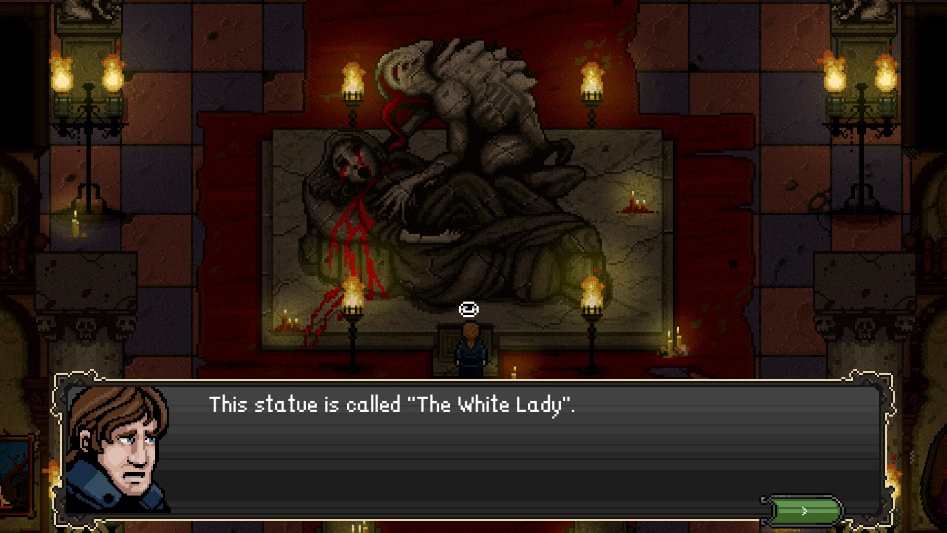 Despite the pixel art style, the imagery and art reflect that sense of “madness” and “darkness” well. The paintings and statues change from their peaceful yet awkward nature to this disturbing and distressing nature. Monsters roam the mansion, strange cobwebs cover the hallways, and blood, rotten food and other stuff can be found in some rooms. It’s distressing and I love it. The sound design also adds to that distressing atmosphere with some rather classical music as well as a lot of silence. I feel like silence in particular is a powerful tool that can immerse you even more into a game, movie or show. It can make normal scenarios incredibly scary and distressing and when you hear the slightest sounds you may. The soundtrack otherwise (when it plays sounds) is nice and comforting at times and distressing and ominous at other times. A perfect fit!